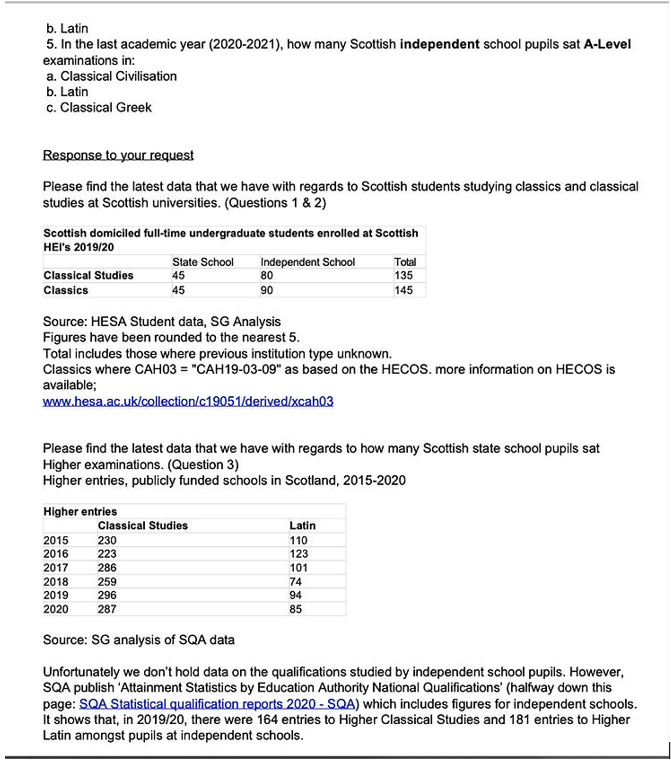 The problem here is that - as the FOI request puts it - “we don’t hold data on the qualifications studied by independent school pupils”, though it is widely understood that many private schools in Scotland choose to study A-Level Classical Subjects through examination boards in England and Wales.