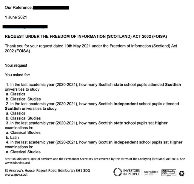 Recently I received a Freedom of Information (FOI) response to a question I asked the Scottish government earlier in the year. Specifically, I was enquiring as to the composition of Scottish university Classics and Classical Studies courses, particularly with a view to the number of state/private alumni they accept.