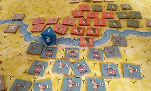Players then take turns to activate units, attempting to meet the victory conditions for that scenario. This will usually comprise of destroying enemy units or seizing and holding key locations on the battlefield. When a unit is activated, it may move and attack if possible. When this occurs, the attacking player rolls dice equal to the unit’s ‘attack value’. Rather than ordinary dice, these are marked with symbols specific to the game. Three sides correspond to the light, medium and heavy classifications. Hits are scored by matching the symbol of the target unit and result in one block being removed from play with each success. There are also three more situational icons. The first depicts a pair of crossed swords. This essentially functions as a ‘wild’ icon for certain units. Another possible outcome is a white flag: this denotes that the target unit has been forced to retreat. In this eventuality, the target unit must withdraw the full extent of its movement value; if the unit cannot complete this move (owing to other units blocking their path for example) they lose one strength for each point of movement outstanding. The final die face depicts a Roman helmet. This icon counts as a hit if there is a commander attached to the attacking unit.