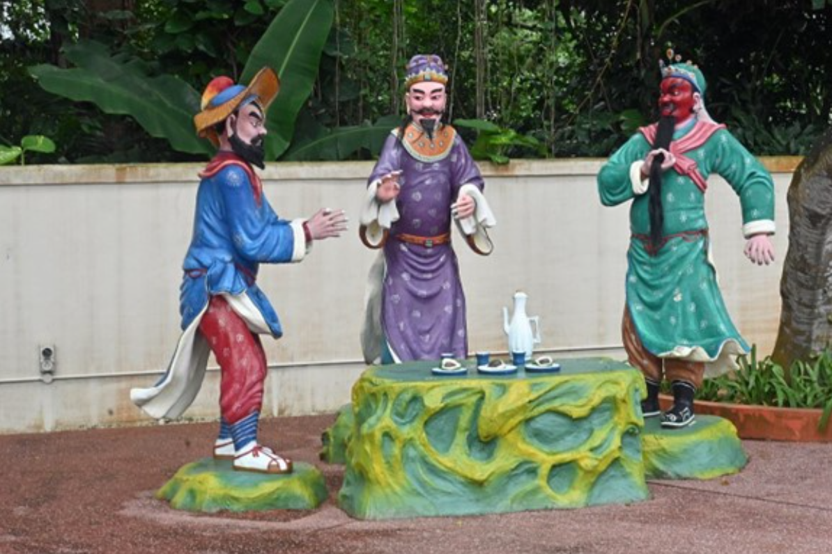 The Oath of the Peach Garden sworn by Liu Bei, Guan Yu and Zhang Fei commemorated in a statue at Haw Par Villa theme park (Image credits: Choo Yut Shing 2022)