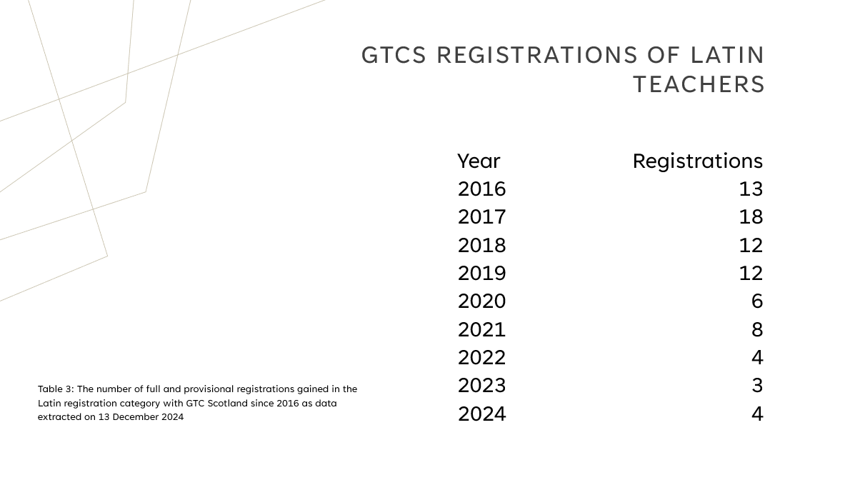 While the General Teaching Council for Scotland (GTCS) has been registering new teachers in Latin over the last several years, these have almost exclusively been teachers from other countries, usually England, who have come to take work in Scottish private schools.