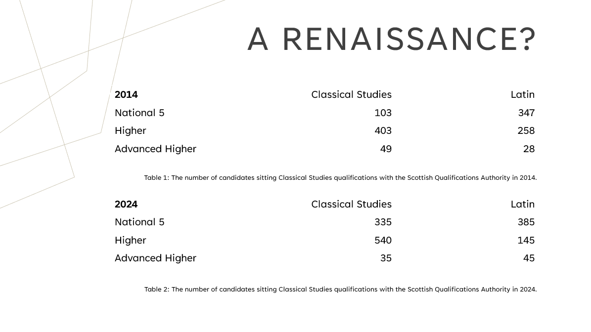 A quick look at the SQA’s own statistics confirm this minor revival: in 2014 just 103 pupils sat National 5 (the certificate usually taken at the age of sixteen) Classical Studies, while in 2024 this figure had more than tripled to 335. Not gigantic numbers, but the trend is significant. Word is out in schools, and head teachers are green-lighting National 5 Classical Studies courses with greater and greater frequency. This year’s data is not yet available, but I am confident, from anecdotal evidence, that these numbers will jump again this year.
